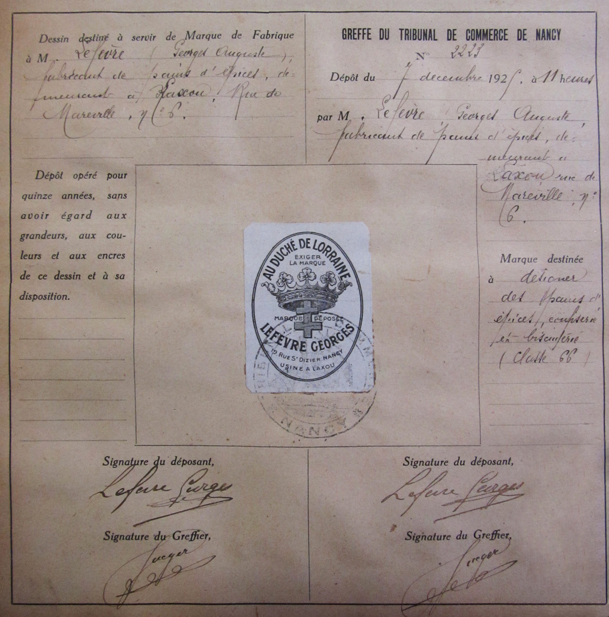 La Confiserie Lefèvre prête à cette occasion ces documents d'enregistrement de dépôts de marque. L'exposition est organisée par la Trésorerie Générale de Meurthe-et-Moselle en liaison avec l'I.N.P.I. et avec le concours des directions des Douanes, de la Concurrence, Consommation et Répression des Fraudes, et de la Chambre de Commerce et d'Industrie de Meurthe-et-Moselle.